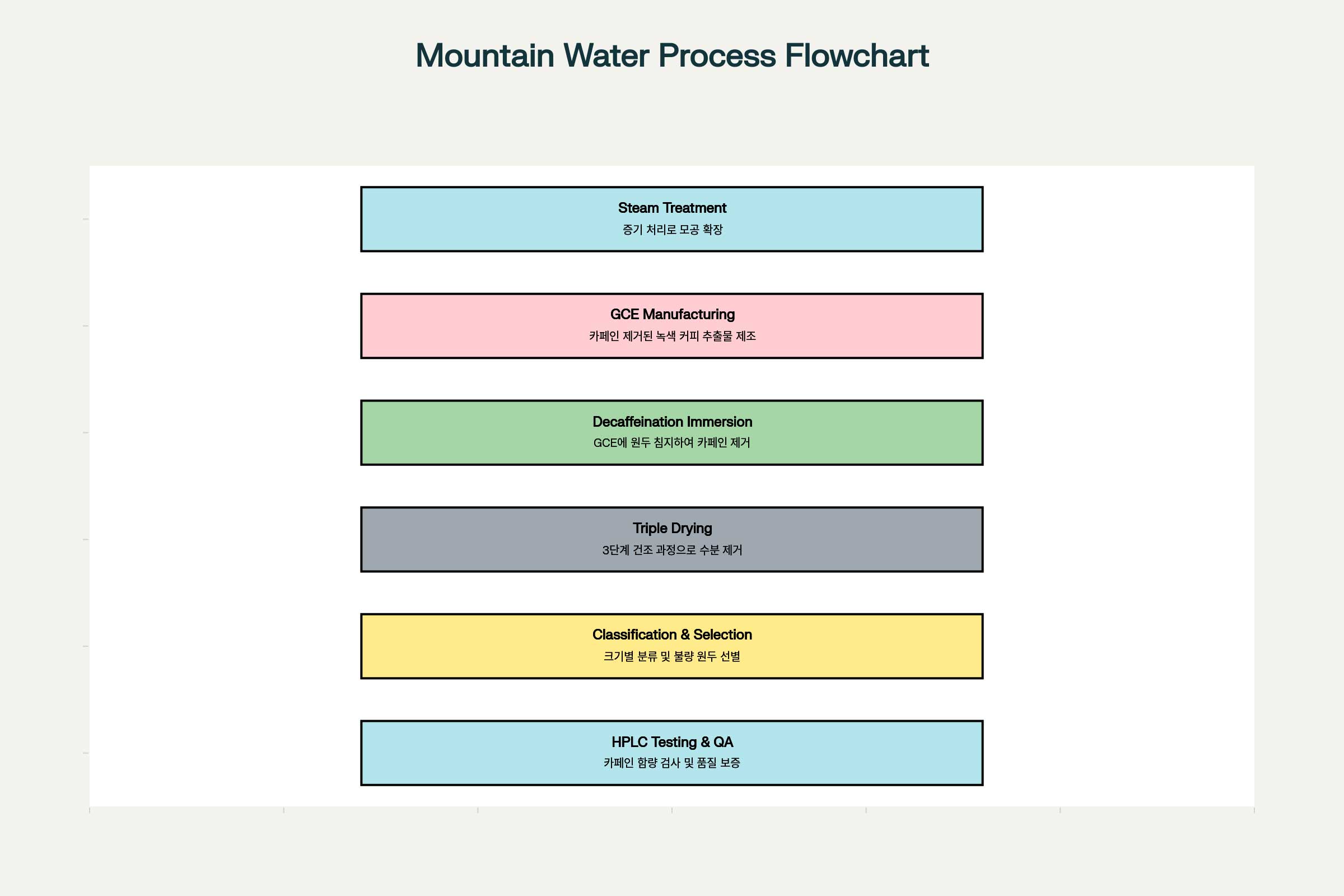 이 과정을 거친 마운틴 워터 디카페인 생두는 깨끗하고 안정된 상태로 완성되며, 향후 로스팅 공정에서도 뛰어난 일관성을 발휘합니다.